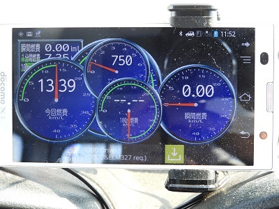 天竜川を通過してからは、ほぼ直線道路が続きます。OBD Driverのデジタル燃費計表示では、走行10km地点通過で、平均燃費13.39km/L。