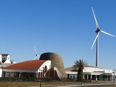 話題を転じて画像背景には、林立する風力発電の水平軸プロペラ群があります。