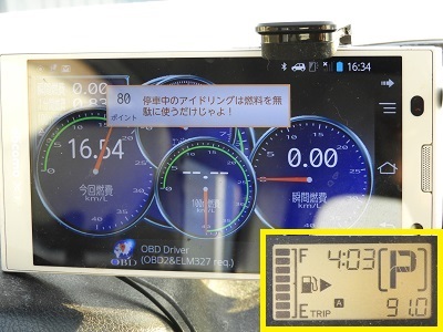 画像は、浜松市街地の某駐車場にて、平均燃費は16.43km/L表示。16:03時点で91.0km走破。