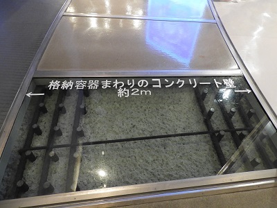 格納容器まわりのコンクリートの外壁の厚さは「約2m」とあります。コンクリートの壁の内部には表側と内側の表面近くに、直径約40mmの鉄筋が格子状に組まれているとのこと。