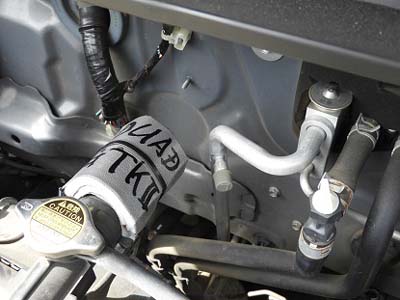 画像9の解説で触れましたが、ラジエター系燃費グッズでは、アッパーよりもロアホースが重要です。走行中の振動などが原因で、緩んで脱落しないように結束バンドの増し締めを作業完了前に今一度。