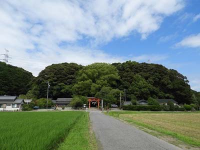 こんもりとしたドーム状の鎮守の森のほぼ中央に、目立つ朱色の鳥居があります。神社であることには間違いないが、その奥がどうなっているのか興味をそそられます。
