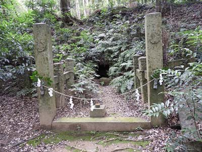 山中八幡宮本殿表参道の手前に、左手に小路が分岐しています。その先にあるのが「鳩ヶ窟」と名付けられた洞窟。