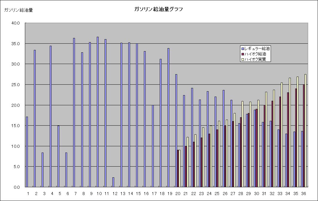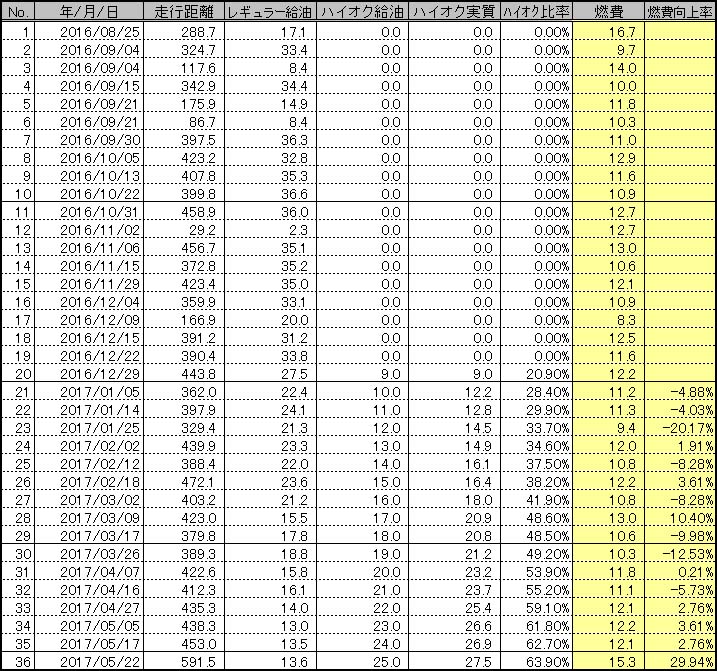第20回の平均燃費はレギュラーガソリンによるもの。ハイオク混合の影響が現れるのは、21回目以降です。