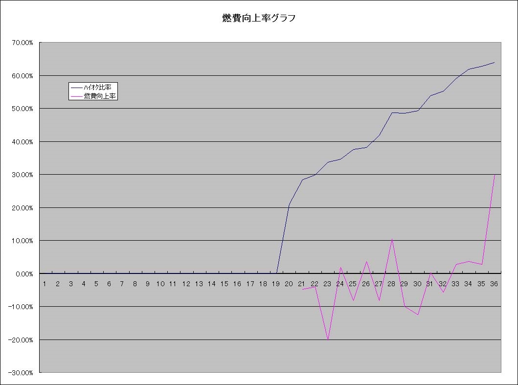 ピンク色の折れ線グラフが、ガソリン混合給油法の燃費向上率の推移。