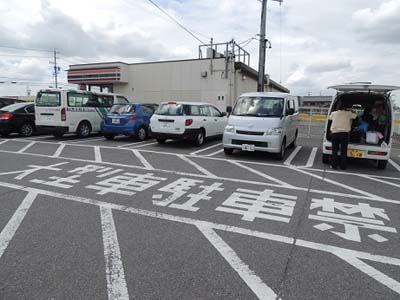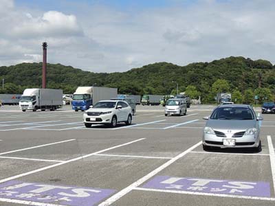 大駐車場は、大型トラックと乗用車が半々。まれにウインドウガラスを空けて駐車している大型トラックドライバーも見かけますが、ここでも7月の猛暑のためにほとんどのクルマは、ウインドウガラスを締めきってカーエアコン付きのアイドリング状態です。