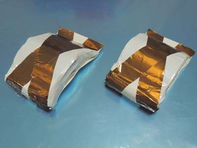 折り曲げた貴宝石コーキング処理した銅合金板と銅サイズで張り付けたエコ・トルマリンシートx11枚分は、短いサイズから順番に、銅合金板-エコ・トルマリンシート、5mm長い銅合金板-エコ・トルマリンシートというふうに積層して11層となる。