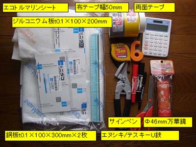 今回のラジエター系自作品の要となるのは、純ジルコニウム板(元素記号;Zr)、エコトルマリンシートと銅板。ダイソー100円プラザの園芸コーナーにある園芸用防虫銅板「虫ヨラズ」帯タイプは、全く見つからず。某ホームセンター販売の最薄t0.3mm銅板は、工作上、難があるのでパス。画像のt0.1×100×300mm銅板(@1,200円)は、ネット販売しているニラコから。 |