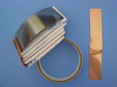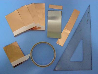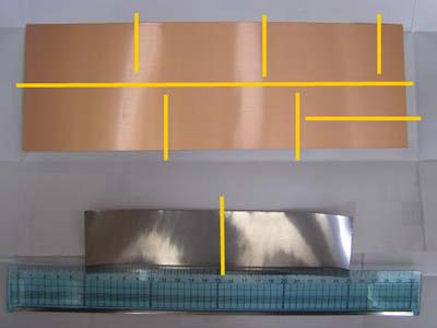 幅50×90、95mm……と5mmずつ長くした5枚の銅板は、各々、10mmの折り曲げしろで折り曲げます。折り曲げた内側の折り曲げ寄りの面に、両面テープを張付け。両面テープは100円ショップより購入した幅20mmのモノ。後に銅板にエコトルマリンシートを張付けるため。 |