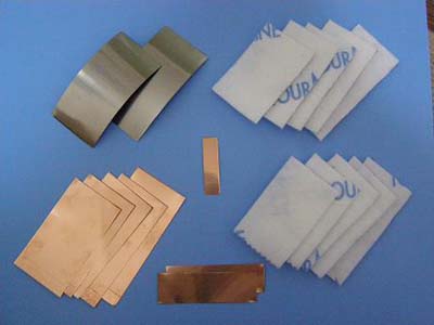 折り曲げしろ10mmで折り曲げた銅板80mm長には、エコトルマリンシート80mm長のものを貼付け。各々、5mmずつ長くしてある銅板とそれに貼付けたエコトルマリンシートのエコトルマリ銅板は、短い板から長い板へ、順に積み上げていき、5層の積層板を組立てます。 |