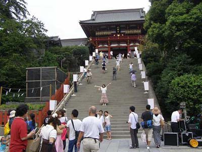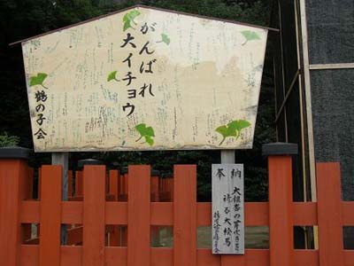 残念なことに平成22年3月10日、強風にあおられて根元から倒れてしまいました。倒壊後、大銀杏は3つに切断され、そのうちのひとつは、寒冷遮の建物に納められ、若芽が伸びつつあります(前画像の「大石段」横参照)。 画像は、大きな寒冷遮の建物横に設置された「がんばれ大イチョウ」の大絵馬。大銀杏の再生を祈る鎌倉市民の心。全国各地の人々の祈りの心に通じています。 |