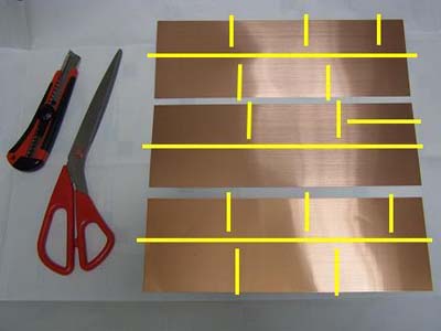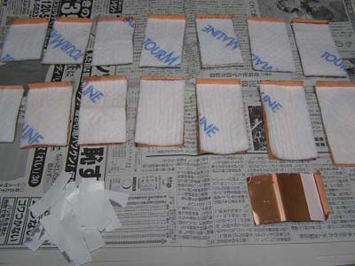 カタリーズ塗布作業の後、両面テープの保護シールをはがして、予め用意してある幅50×70、75、80、85、90、95、100mm長の7枚のエコトルマリンシートを、各々、長さを合わせてある7枚の銅板に貼付けていきます。 |