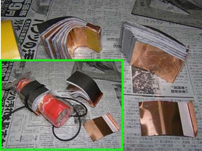 さてエコトルマリンシートを貼付けたカタリーズ塗布銅板7枚を、折曲げしろの角部を合わせて、長さの短い板から順に積層していきます。一番上には反射材にあたるt0.1×50×100mm純チタン板を被せます(画像では上段右)。次に銅板の端材で作った幅20mm横ベルトで折曲げた部分を固定します。横ベルトが折重なった部分は、布テープ(画像では上段左の黄色の布テープ)で貼り合わせて仕上げます。 |