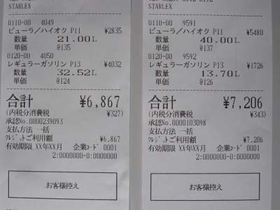 画像左は、同一のクルマに最初、ハイオクガソリン21.00L給油し、次いでレギュラーガソリン32.52L注ぎ足して、満タン53.52Lとした証となるレシート。2週間後、レシート右のように、レギュラー仕様車の混合給油のハイオク比率を約2倍にしてみました。 |