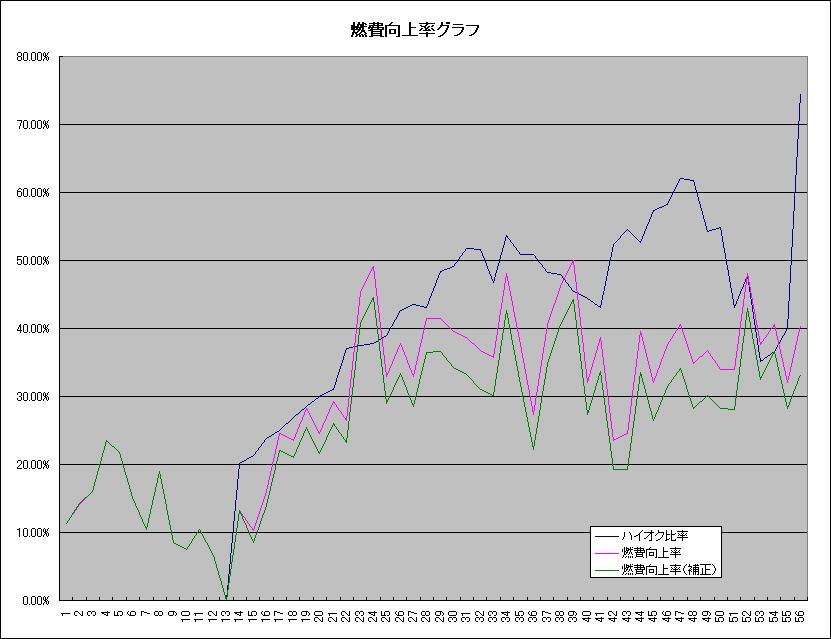 ガソリン給油量グラフと照合するために、燃費向上率の変化をグラフに表してみました。縦軸が燃費向上率(ピンク色線)および補正後の燃費向上率(緑色線)とハイオク比率(青色線)。いずれも単位は%。横軸が過去56回に遡った満タン給油回数。それまでの燃料添加剤投入を止めて、影響がなくなった第13回目の平均燃費10.6km/Lのときを基準のゼロとしています。 |