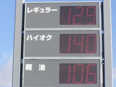 画像は2010年2月6日現在の浜松の某ガソリンスタンドの電光掲示板です。レギュラーガソリン価格@129円/L。ハイオクガソリン価格@140円/L。 |