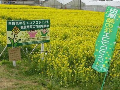 道の駅にあるパンフレットによると、(1)遊休農地の土壌改良・景観形成として菜の花栽培、(2)菜種油を学校給食・特産品に利用、(3)廃食用油を燃料化して、公用車、バス、農業機械に利用と記載されています。 さて早春の1月9日〜3月31日は、渥美半島菜の花まつりを開催。国道42号線、同じく159号線を主軸に街道沿いいたるところに菜の花が咲き乱れ。 国土交通省が進める日本風景街道の東海ブロックの一つに、渥美半島菜の花浪漫街道が選定されているのがうなずけます。 |
