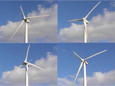 伊良湖クリスタルポルトから国道259号線を北上すること3km程、伊良湖神社北の看板のある信号付近に、風力発電システム1基を、国道沿いに見ることができます。 国産品の風力発電システムメーカーとしては、日立−Enercon、富士重工業などが挙げられますが、ここにあるのは三菱重工業製。 WEBサイトで調べると「ブレードの風切り音はやや小」とありますが、間近にいると海岸に近いとあって、おりからの周囲の肌寒い強風で、ごうごうと風を切りながらプロペラが勢いよく回転しています。 さながら「風と電気のモニュメント」と受け止められるので、4つ並べてみました(笑)。 |