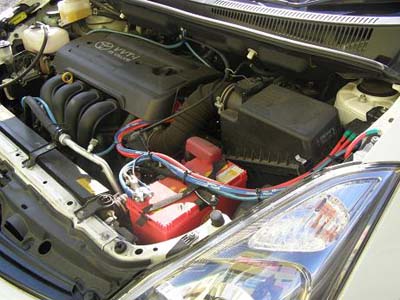 エンジンヘドカバー下から見られる赤色の14sqH-KIV電線は、シリンダーヘッド周りのアーシングポイント4点を持っています。赤色電線と並走しているのは、同じくスプリットファイヤ社「Dスパーク」。ミニバンの乗り方・走らせ方7「ガソリン混合給油法2」から、画像「Dスパーク装着」を参照してください。