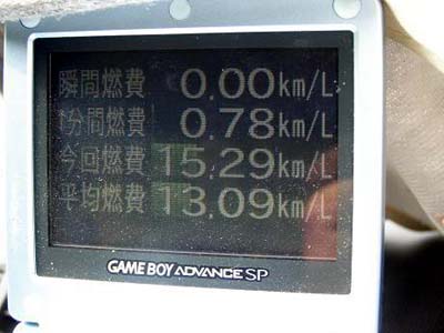 ディスプレイ部に、バックアップライト機能を持つゲームボーイアドバンスSP(別売り)をダッシュボード上に設置。表示数字は大きく、均一で視認性も良い。補正作業もそれほど難しくありません。点火タイミングも表示できるスグレモノです。 |
