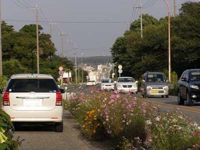 撮影は秋半ばで、コスモスが咲いていたので坂の頂上付近でワンショット。
