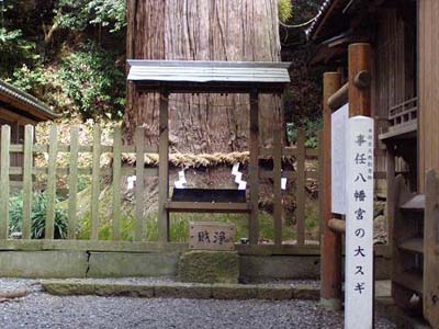 事任八幡宮の境内にある、高さ31m、根回り19.3mの大クスノキに神々しさを感じますが、本殿東奥には「事任八幡宮の大スギ」があります。種別「天然記念物」として掛川市指定文化財とされています。高さ36.5m、根周り11.2mの巨樹。樹勢良好で逞しさがみなぎり、地元では「八幡宮の大杉さん」と親しまわれています。