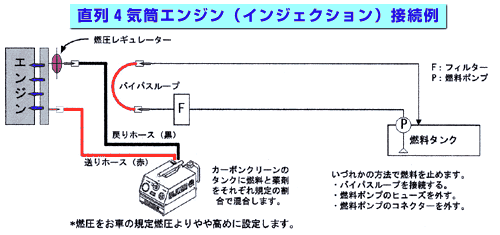 こちらが通常の接続方法です。 車両側の燃料ラインはバイパスループしていますが、これが原因でガソリンが漏れてしまいました。 |