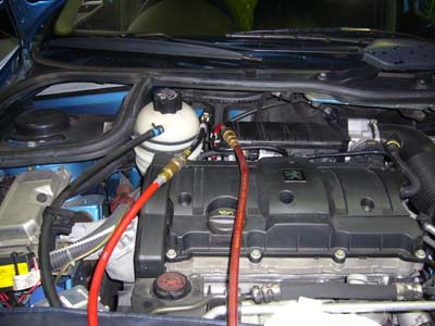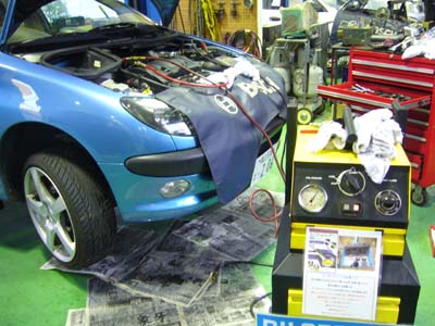 カーボンクリーン処理中のプジョー206です。 下の濡れた新聞紙は、バイパスループしてガソリンが漏れた跡です。 |