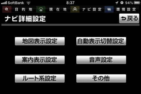 [ナビ詳細設定]をタッチすると、各種設定を行うことができます。 ナビ詳細設定では、書ききれないくらいの色々な設定を変更することができます。 |