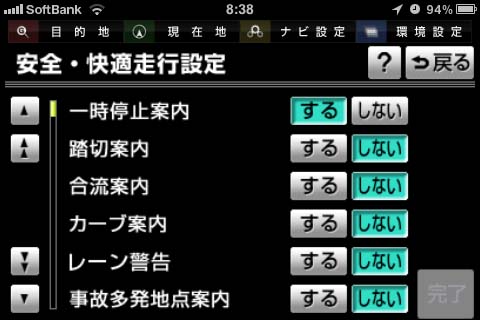 [運転支援]タブをタッチすると安全・快適走行設定画面が表示されます。 ここでは案内に関する内容が主な設定内容となります。 |