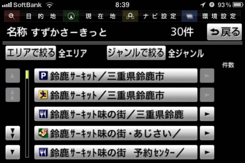 「すずかさーきっと」で検索すると、鈴鹿サーキットに関する目的地が検索表示されます。 検索速度も速く、検索結果をさらに「エリア」や「ジャンル」で絞り込むことができます。 |