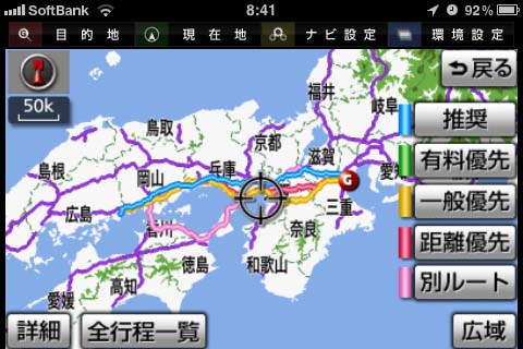 一般的なカーナビの用に、優先別のルートが表示させるのでルートを選択します。 navicoでは、条件を設定してルートを検索でしたが、NAVIeliteでは自動的に複数の条件(優先)でのルートが表示されます。 |