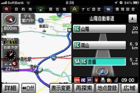 実際にナビゲーション(案内)中の画面を紹介したいのですが、運転中にiPhoneの画面コピーをとるのは危険なので、NAVIeliteの機能としてある「デモ案内」を利用しました。 高速道路では、どの車線を走行すれば良いのか、右側に表示されます。 |