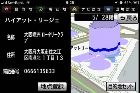 ビルなどを選択すると、ビル内にある情報などが一覧表示されます。 一覧表示された中から情報を選択すると、さらに何階にあるかまでわかる情報が表示されます。 |