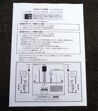 日本語の説明書と言っても、簡易取付け説明書は1枚と、別にトラブルシューティングの説明書が1枚だけです。 取付けてもらったショップの方に聞くと、最近のHIDキットの取付け(特に配線)は簡単になっているそうです。 実際にバラストとバーナー(HIDバルブ)の接続も簡単で、実際に私が配線を見ても、簡単に理解できる内容です。 装着に難しいのは、バーナー(HIDバルブ)の装着と配線の引き回しと バラストの取付け場所を決めることだと思います。 但しヘッドライトのバルブへのアクセスが簡単なことが条件で、ポロのようにヘッドライト自体を外さないと作業できない車種などは、プロに任せた方が安心だと思います。 |