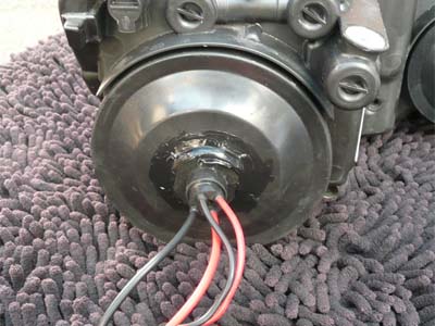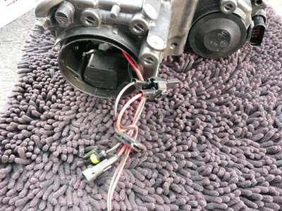 バーナー(HIDバルブ)に交換したバルブをポロのヘッドライトユニットに装着します。 出ている配線は、バラストに接続する線と、ポロの車体側のヘッドライト点灯用カプラーに接続する線です。 つまり、電源はバッテリーから直接取るのではなく、ポロの車体側のヘッドライト点灯用カプラーから供給されることになります。 |