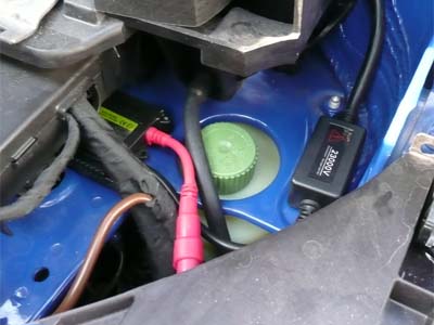 助手席側のバラストとイグナイターの取付け状態です。 位置はヘッドライトユニットの下側になり、ヘッドライトユニットを取付けると、ほとんど目に付かない場所です。 バラストの厚さが14mmと言う薄型なので、この場所に取付けができたのだと思います。 実際の取付けは、取付けるボディ側をしっかり脱脂した後、強力な両面テープで取付けていました。 |